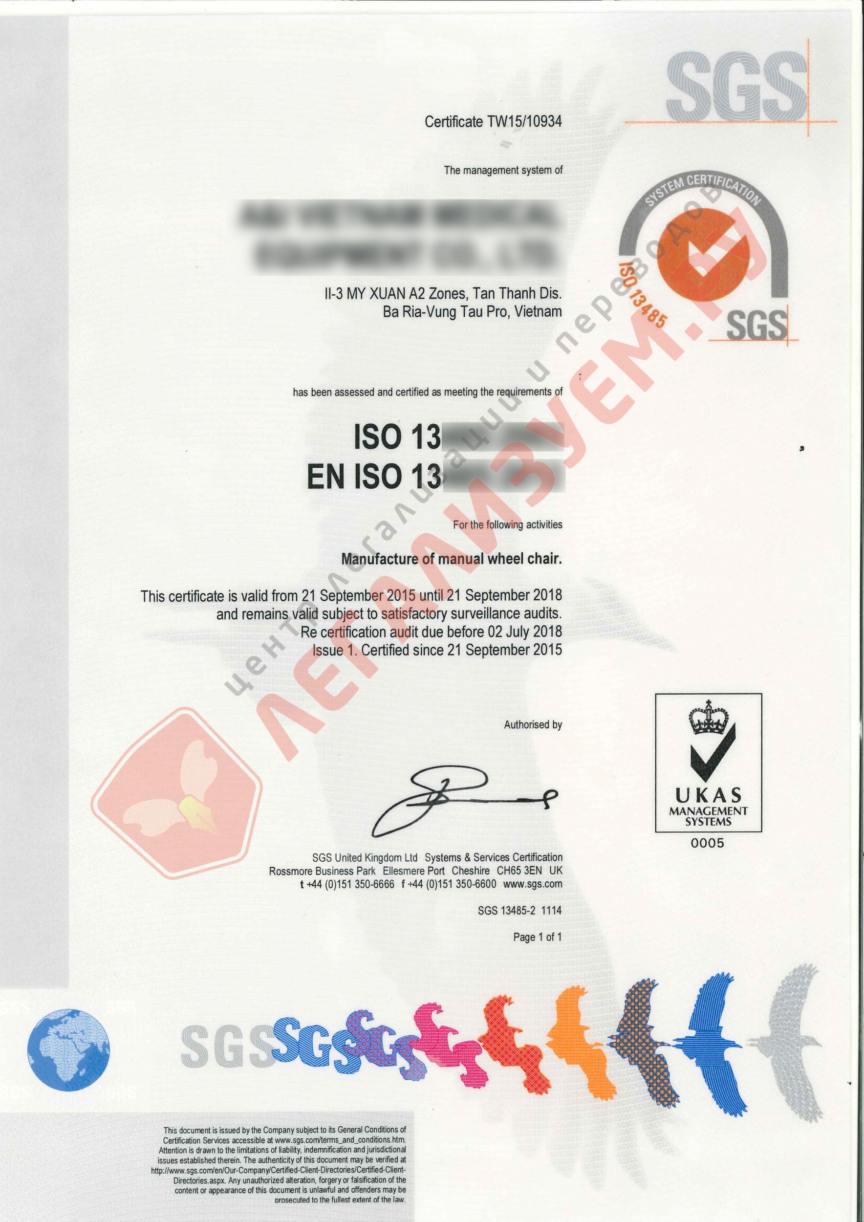 Наши клиенты ошибочно полагали, что данный документ необходимо апостилировать во Вьетнаме, поскольку компания, в отношении которой был выдан сертификат, зарегистрирована там. Они обратились к вьетнамскому нотариусу, который естественно не уполномочен на проставление апостиля, более того Вьетнам не является участником Гаагской конвенции. При любом раскладе апостиль во Вьетнаме проставить было бы невозможно. Вьетнамский нотариус рекомендовал обратиться к нотариусу в Тайване, поскольку данный ISO был получен нашими клиентами в Тайваньском отделе SGS. Но снова шаг неверный, поскольку Тайвань также не является участником Гаагской конвенции, и пришлось бы делать полную консульскую легализацию, тайваньский нотариус также не уполномочен ни на проставление апостиля ни на оформление легализации. Но самое главное, что страна выдачи документа – Великобритания. В Тайвань доставили уже готовый сертификат, чтобы компания могла его получить, но выдан он был именно в Великобритании. Апостиль имеет территориальный признак и проставляется только по месту выдачи. Обратившись к нам, наши клиенты смогли разрешить свою проблему, которой в принципе изначально не было, просто обращались они к специалистам, в чьей компетенции не было знаний, чтобы направить их в нужном направлении.